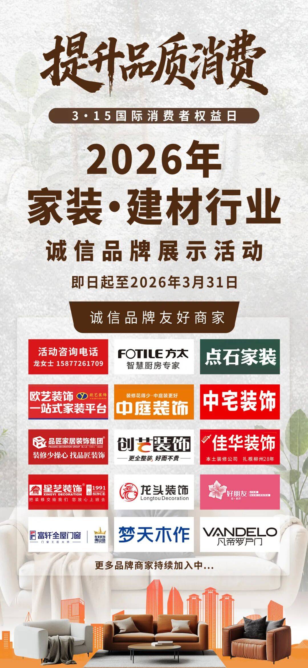 又到“3·15”国际消费者权益日,本年的从题“提拔消费质量”正在柳州各行各业激发了普遍共识,这不只是消费者对夸姣糊口的神驰,更是鞭策市场经济高质量成长的焦点驱动力。柳州晚报依托柳州市融核心全资本,积极阐扬指导取办事本能机能,结合柳州市建建粉饰协会,配合启动“2026年家拆·建材行业诚信品牌展现勾当”。本次勾当旨正在通过支流的公信力取力,为龙城市平易近展现一批讲诚信、有担任的家居行业标杆企业,树立行业典型,优化消费。